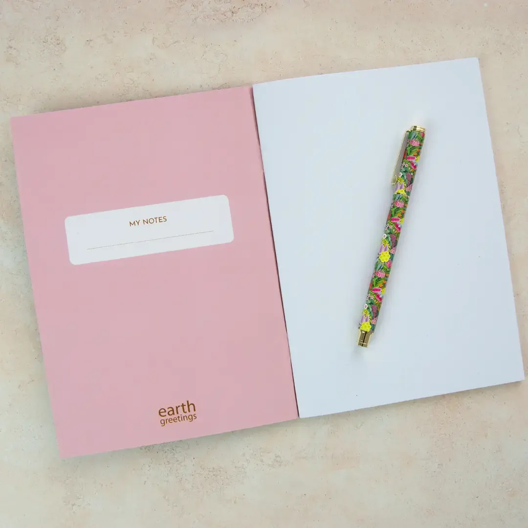 100% recycled, Earth friendly blank notebook featuring Australian native floral artwork by Australian artist Jayne Branchflower.