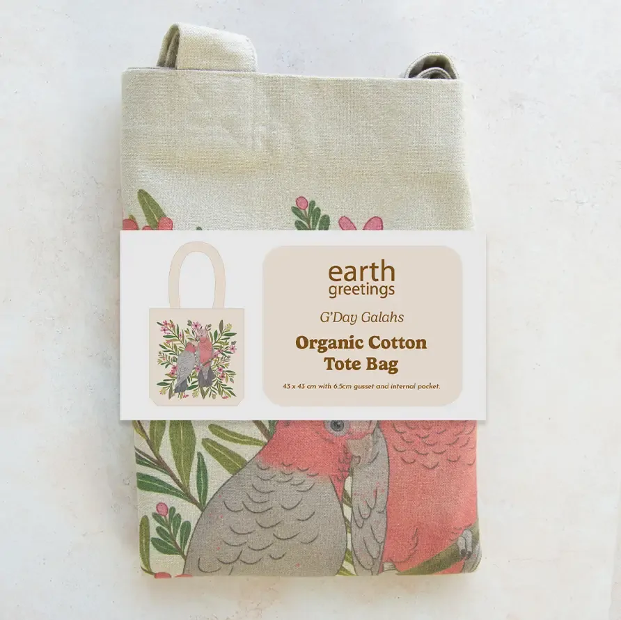 Carry your stuff in eco-style with an Earth Greetings tote bag. It's got nice long handles that fit comfortably over the shoulder, a gusset for extra roomyness and pocket inside to keep your phone and keys safe. Ethically made from sturdy yet soft, Australian Certified Organic mid-weight cotton canvas, and printed in Australia using water-based ink.