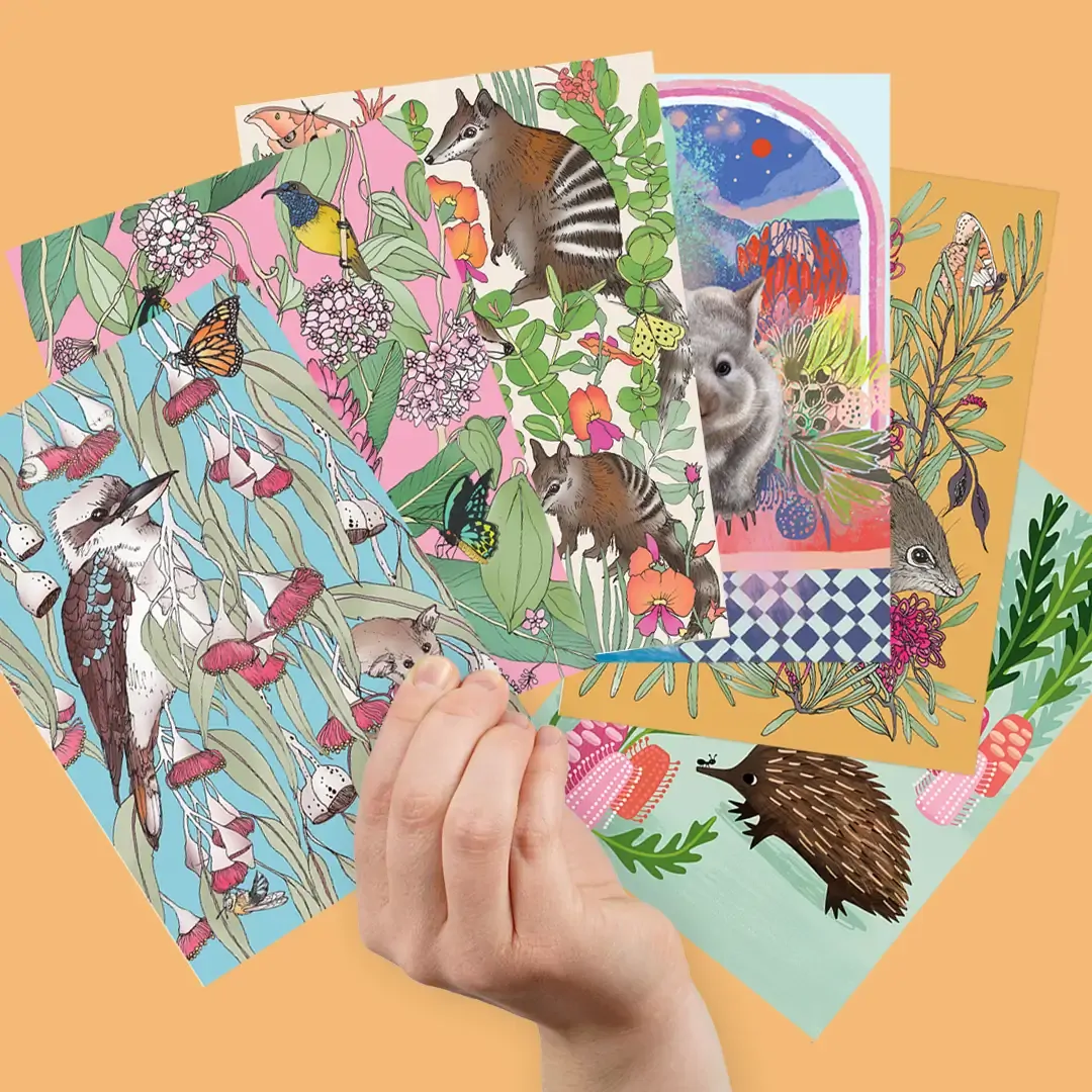 Includes 6 x full sized greeting cards, featuring Australian fauna illustrations by Australian artists.